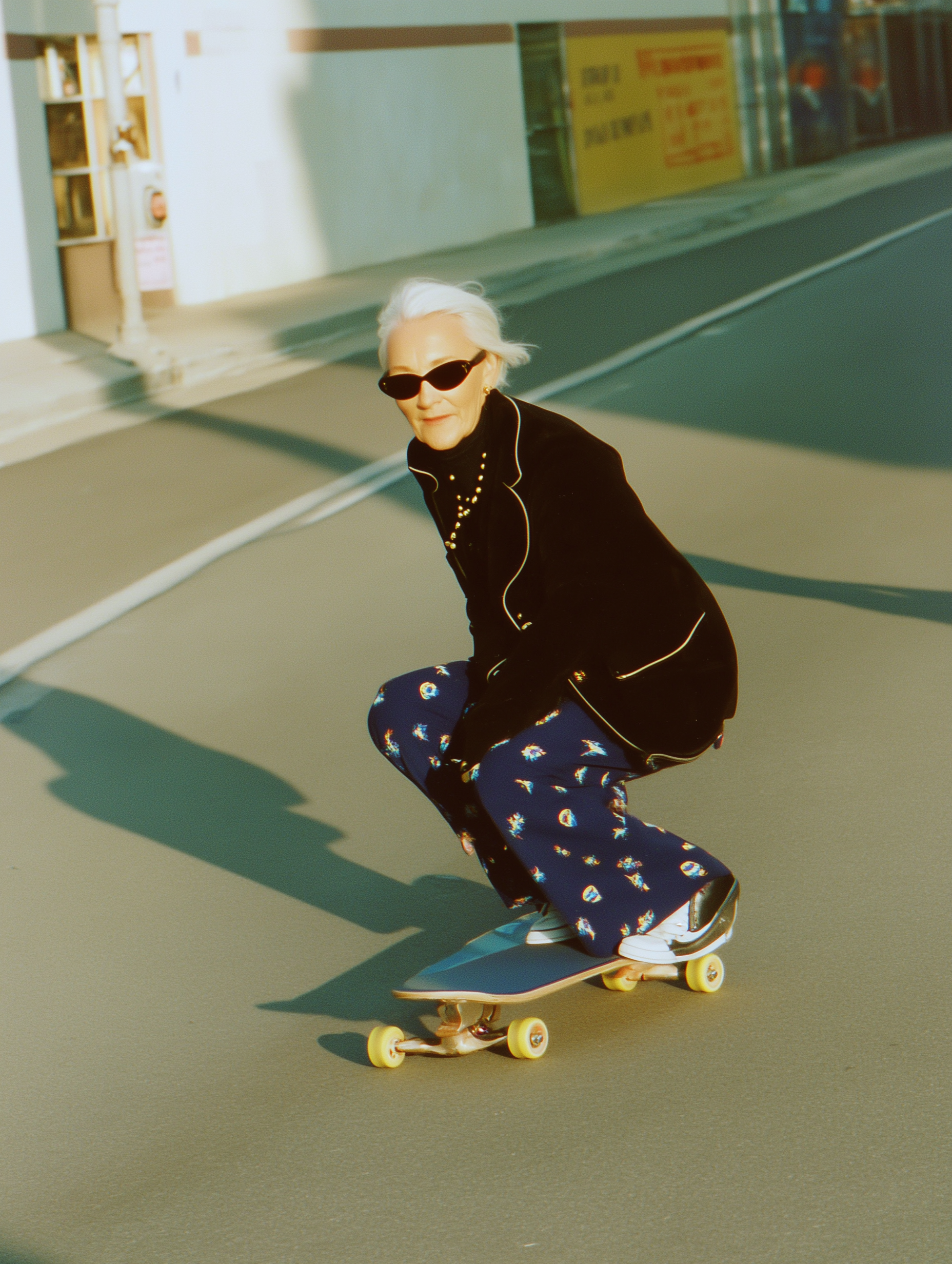 She wears a long, sharp-shouldered Chanel coat, blue or pink, and glides through polished marble hallways on a skateboard. Her laughter cracks the stillness. Her courage is unstoppable.